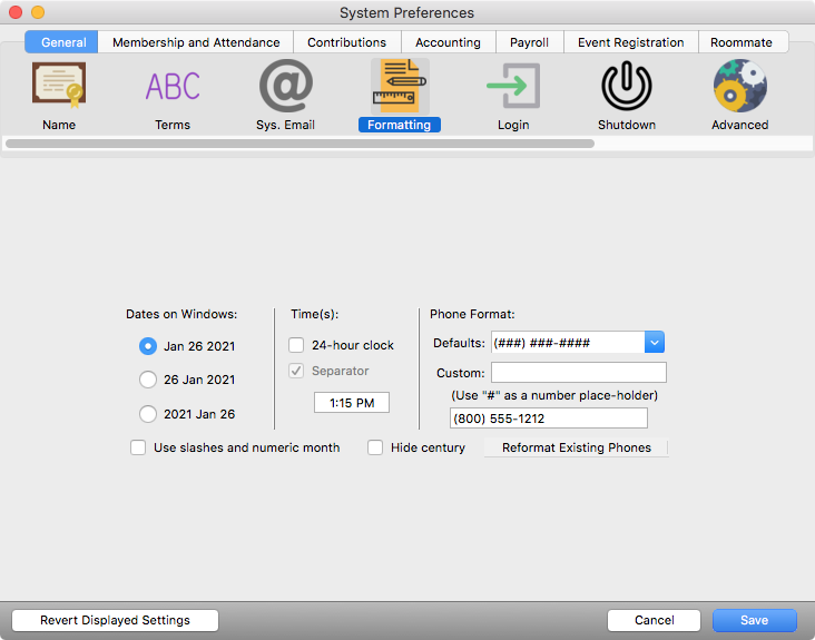Here you can set the system-wide format of Dates, Times, and Phone numbers. Clicking the Reformat Existing Phones button will change all phone numbers on CDM+ record windows to the specified format.