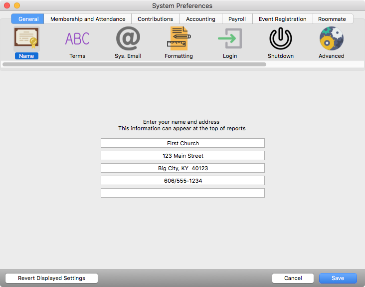 Enter or change your church’s or organization’s name, address, phone number or any other information here that you would like to (optionally) display at the top of reports.