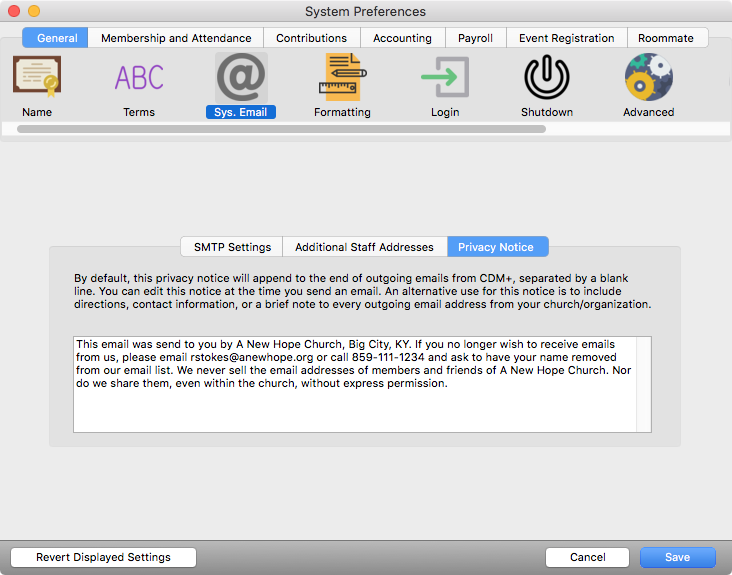 A default privacy notice may be added under the Privacy Notice tab on the Preferences window that will append at the end of outgoing emails.