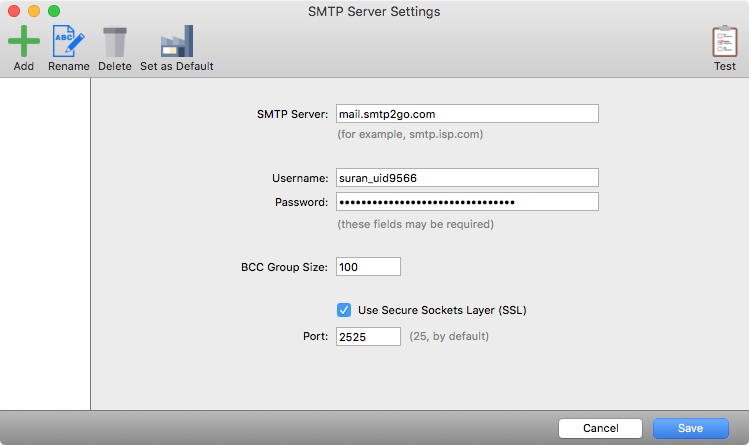 Click Add to add a new server. It will prompt you to name it; click OK. You will see the exact same window as in the screenshot above. Fill everything out according to your email provider and click Save.