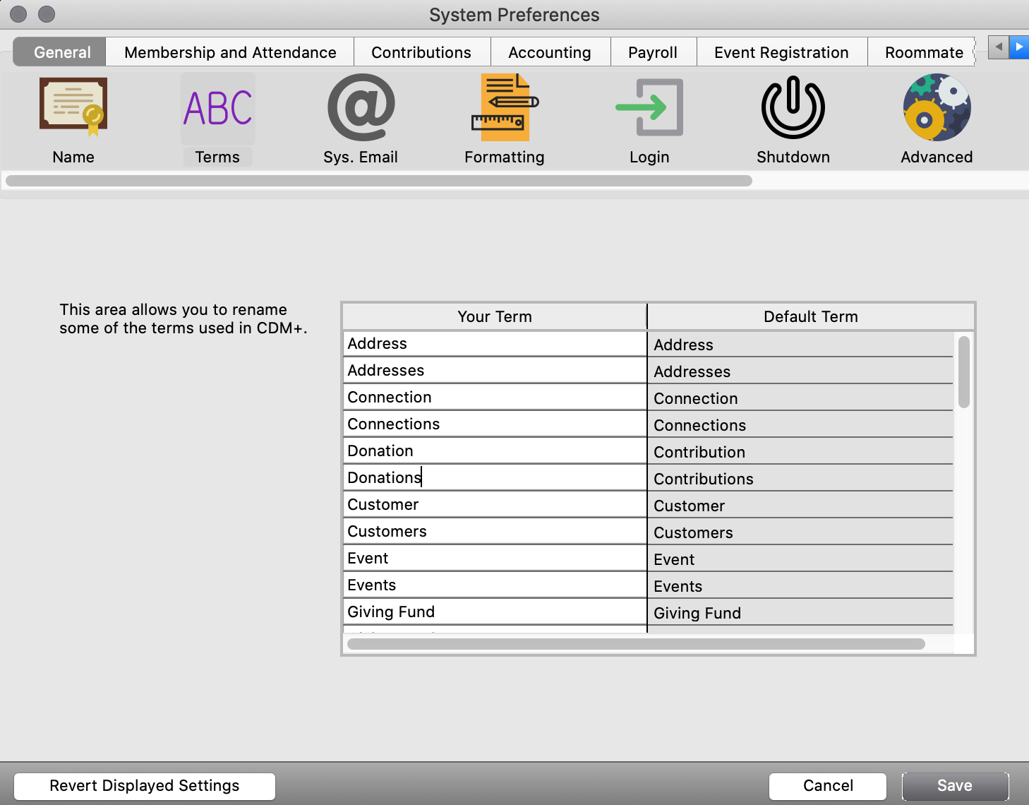This pane allows you to rename some of the default terms used in CDM+. For example, if you prefer to use the term Donation instead of the default Contribution, highlight Contribution in the Your Term column and type Donation.