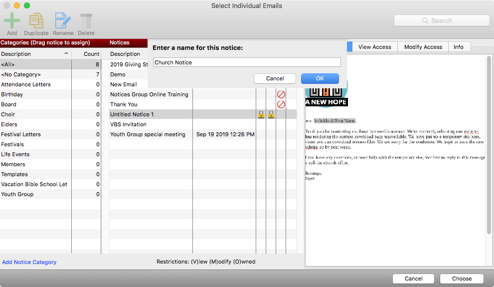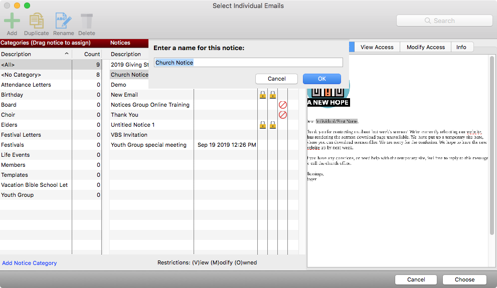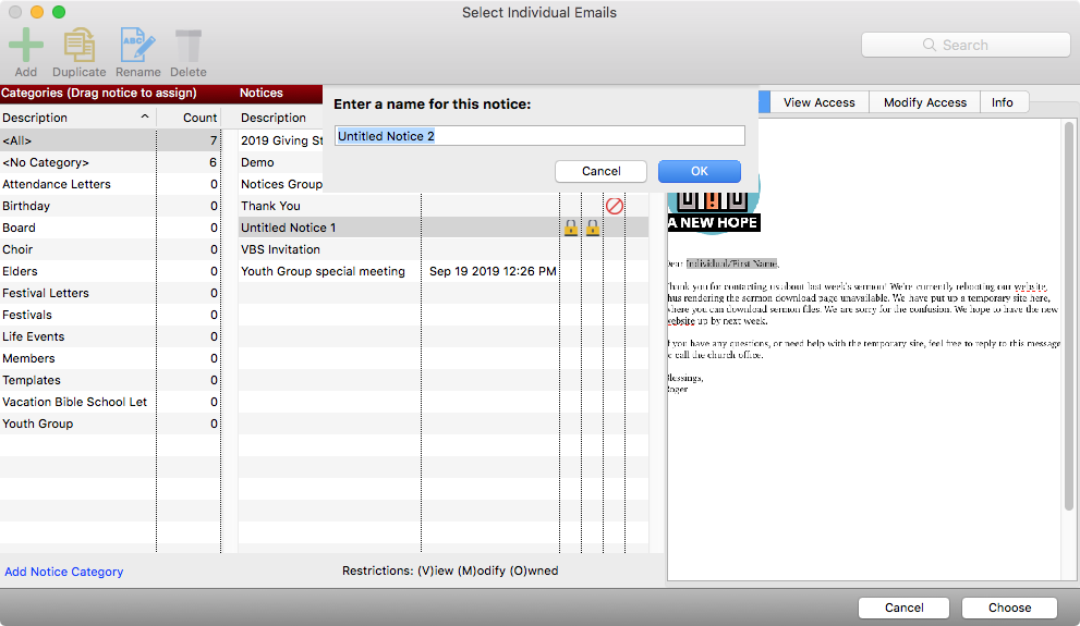 To rename an existing notice, click it once to highlight it and click the Rename button. You will be prompted to give this letter a new name.