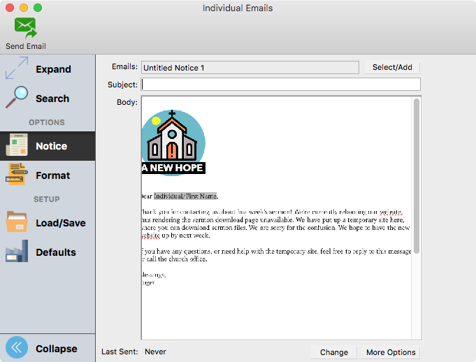 The example below is an Individual Letter Email from the Membership Reports menu, but the steps apply to any Notice (letter, card, email) in CDM+.