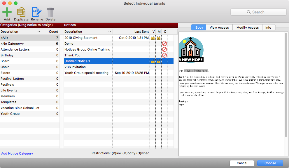After clicking OK, you will see the new notice in the list. Click once on the name of the notice to highlight it and click the Choose button. The new notice name will now appear in the notice report window, but the Body field will be blank. Click the Change button to type and format the letter.