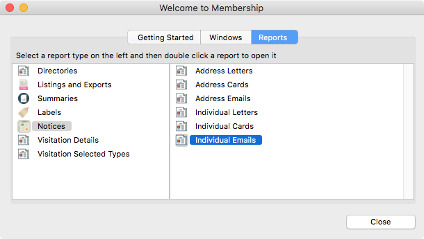 You can access Notices from the CDM+ Reports Menu. For our example, go to Reports → Membership Reports → Notices → Individual Emails