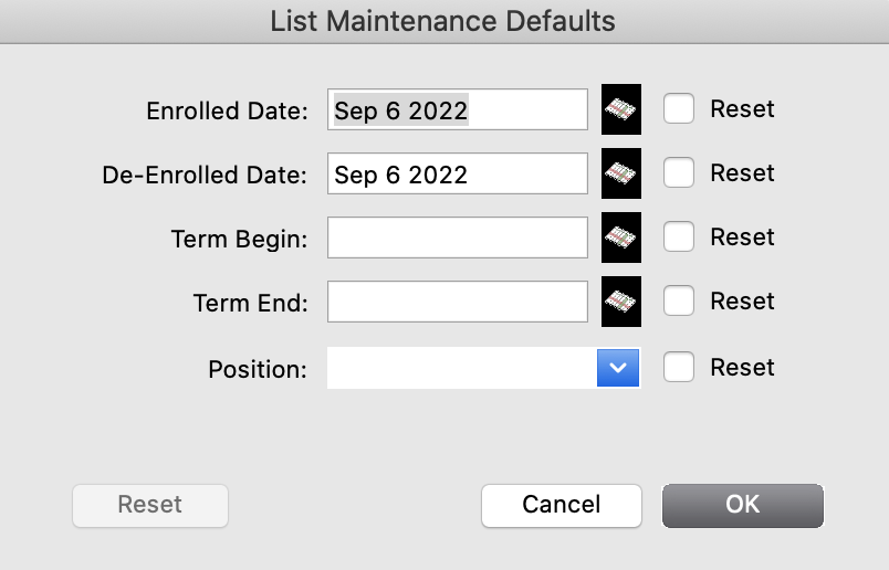 Enter the desired information, click OK, and those fields with default values will auto-fill when you add a new individual to the group. To change all individuals in the group to one or more default values, check the Reset box next to the desired field(s) and click the Reset button.