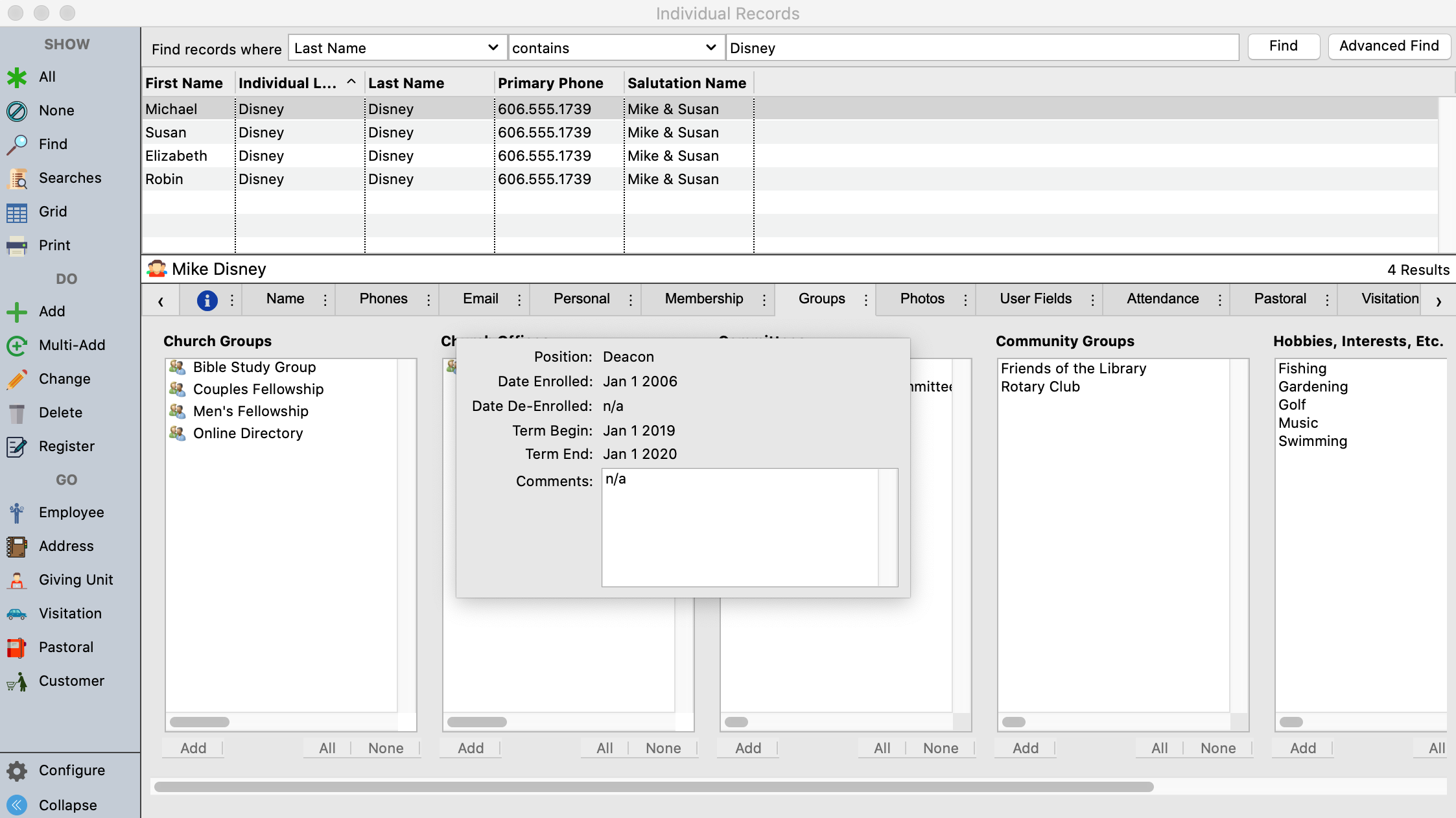 The detailed tracking information entered in the Individual List Maintenance is available on the Individual Record window. For example, if you choose to enable Detail Tracking for Church Offices, when you select the Groups tab on an Individual Record window, you will see an icon next to the groups listed under that type. Click on the icon to see details of this individual’s membership in the group.