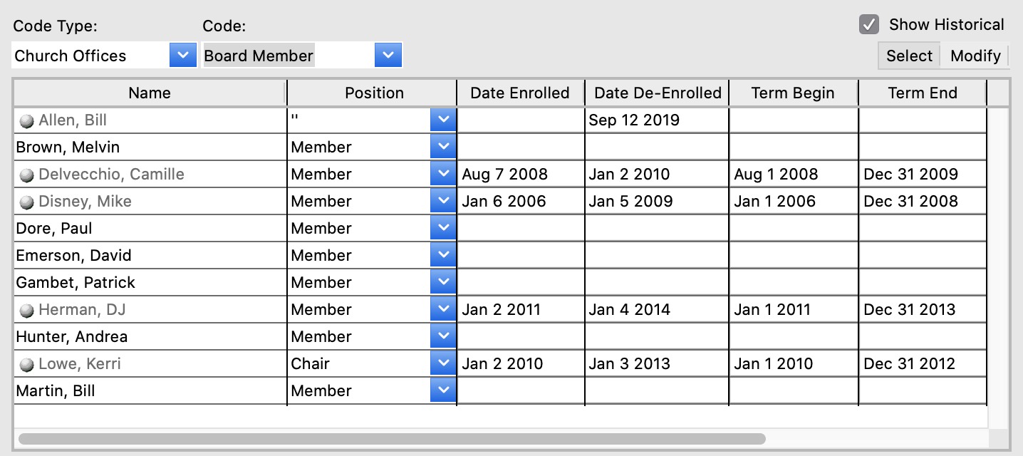 To the right of the list of individuals assigned to this code are columns for Position, Date Enrolled, Date De-Enrolled, Term Begin and Term End. This is the detailed information you can now track. Click on Modify to change information for existing individuals. Select a Position from the drop list or type to add a new Position code, such as Member or Chair.