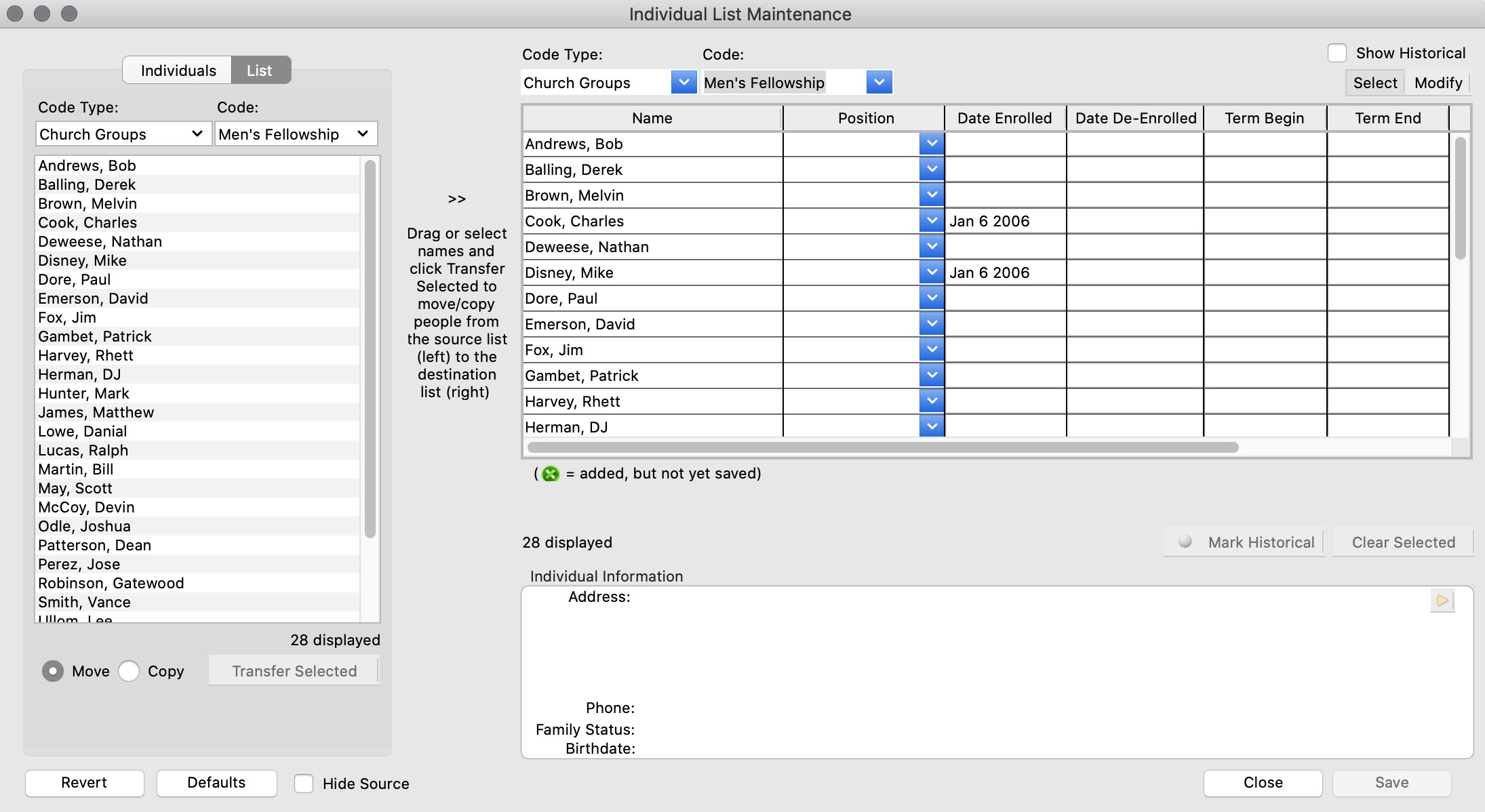 To add detail for group codes assigned to individuals, open the Individual List Maintenance window and select one of the groups (codes) for which you checked the Detailed Tracking box on the Master Coding window. You will now see some additional items displayed on this window.