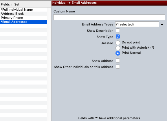 Unlisted indicates how email addresses marked as Unlisted on the Email tab should be handled in the export. Do Not Print will cause the export to skip the email address. Print with Asterisk will cause an asterisk to appear following the address. Print Normally will treat the email address as though Unlisted is unchecked.
