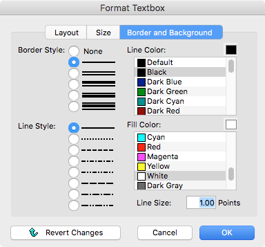 Use the buttons to select a Border Style and Line Style. If you wish to create a text box with no border, (i.e. to place a caption under a photo,) leave the Border Style as None. With no Border Style chosen, the Line Style selected is immaterial.