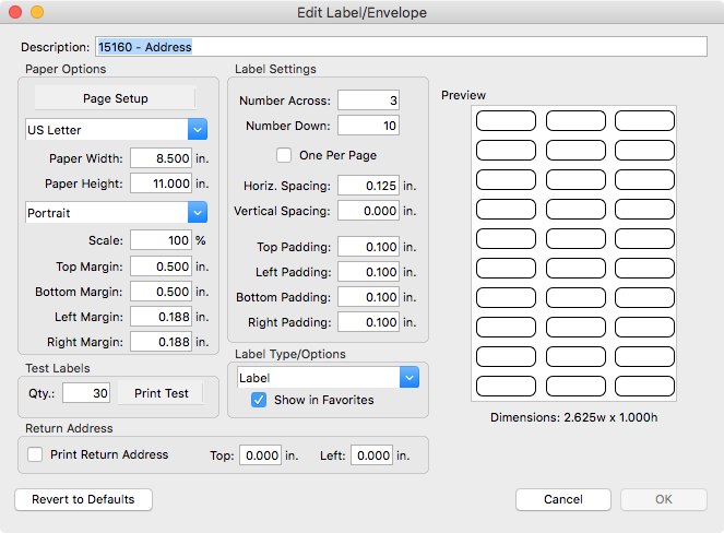 The Labels/Envelopes tab is only found on Labels/Envelops reports. Here, you can select from pre-defined label formats, listed by their Avery® label number. Click on a numbered label format in the list on the left and you’ll see a graphical representative of it on the right.