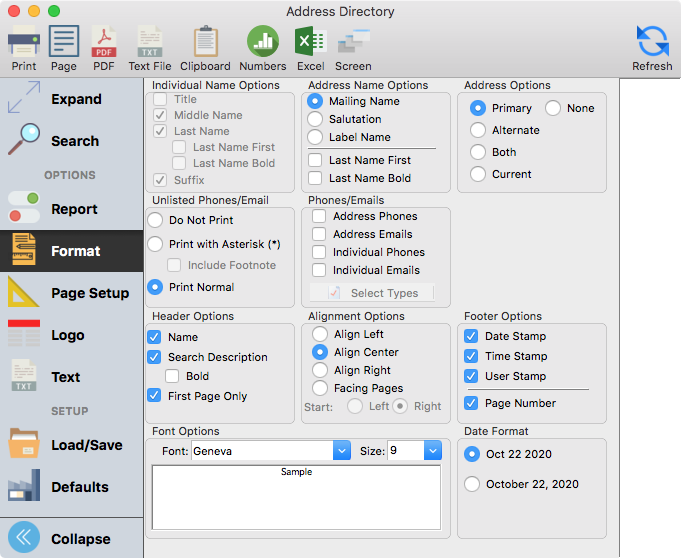 For example, on the Format Options pane on the Address Directory report setup window, you can specify which (if any) address to print, how to treat Unlisted Phone Numbers, and how to include Other Phone Numbers or Email Addresses into the report.