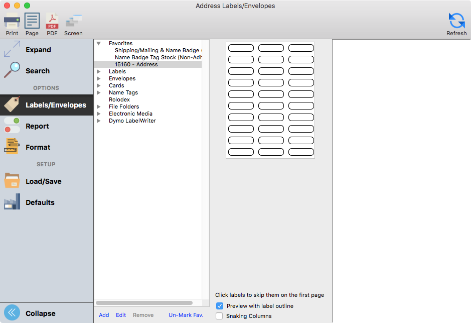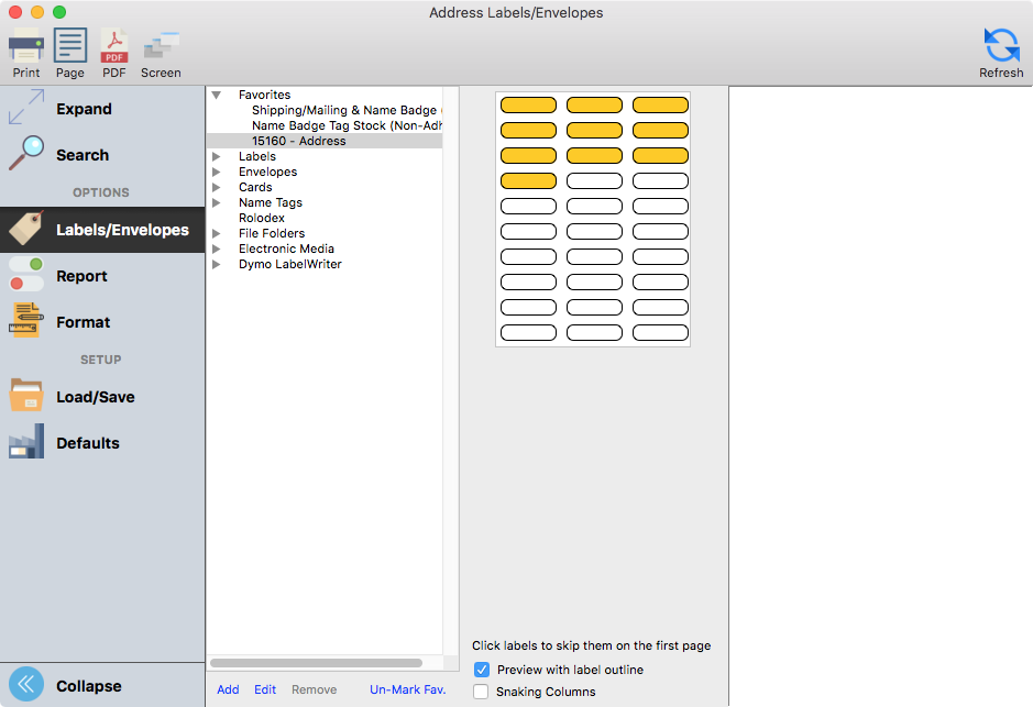 Highlight a label or envelope format and click the Mark Favorite button to move it to the top of the list under Favorites.