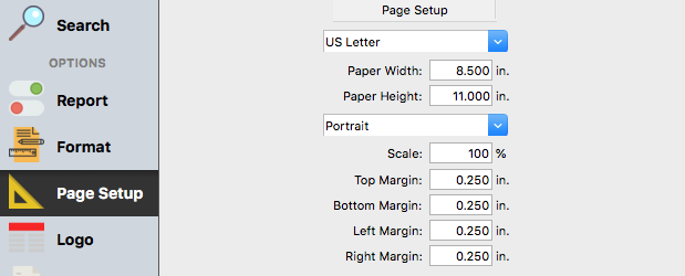 The Page Setup tab provides much flexibility when printing a report. Here you can specify the paper size, orientation, and margins.