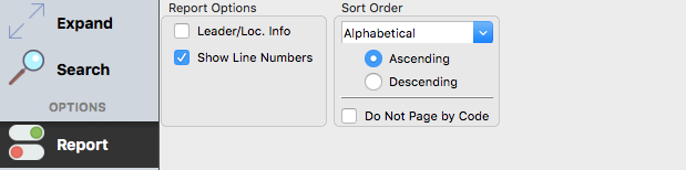 The Report tab has options specific to the report you are creating. Options under Report will vary greatly from report to report.