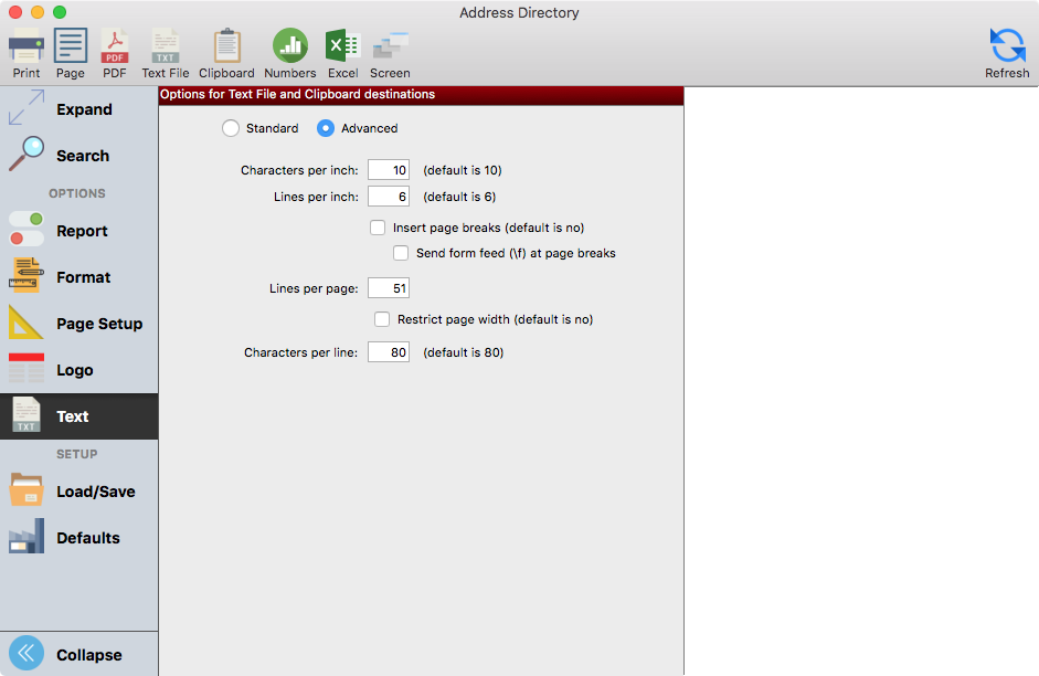 The Text tab is useful for specific saving methods. If you are going to save your report as a Text file, or copy it to your Clipboard to paste into a different document or program, you can specify here all the details. If you select Standard, it will use the program defaults. If you wish to customize you, select Advanced and change the settings accordingly.