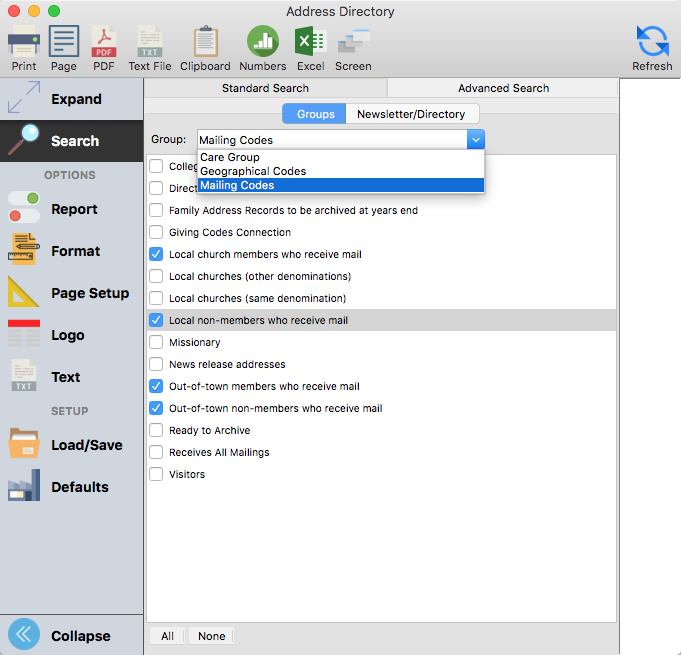 For example, two reports that include information from the Address Records will both have a Groups tab with a drop list to select a group and checkboxes to select codes within that group.