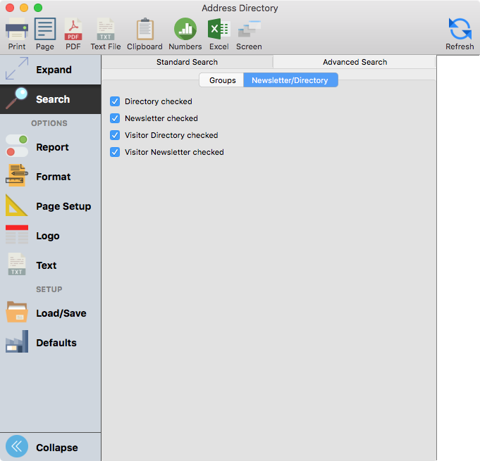 In addition, both will have a Newsletter/Directory tab where you make selections based on the Newsletter/Directory check boxes on the Address Records and Visitors Records windows.