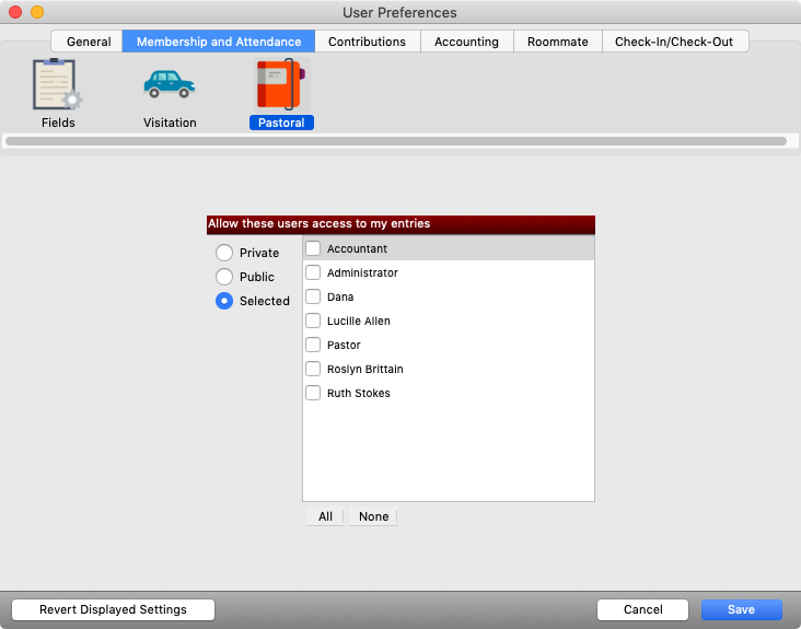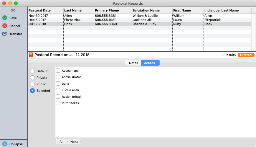 - Private makes the Pastoral Record available only to the owner/creator of the record.