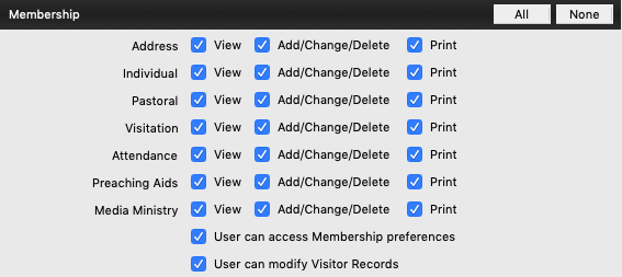 Permission to view, add, change, delete, and print Pastoral Records is controlled on the Users pane of the Administration window. In the Membership section.