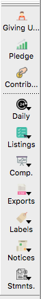 For example, if the Financial Administrator only works in the Contributions program, they may choose to set their CDM+ User Preferences to display only the Contributions toolbar. They can also choose to keep it separate, and display it on the left side of the screen. If they want a reminder of what each icon opens, they can select the Show Text checkbox.