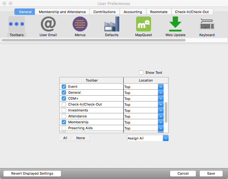 To customize your CDM+ desktop, go to CDM+ → Preferences → CDM+ User → General → Toolbar on macOS or File → Preferences → CDM+ User → General → Toolbar on Windows. Here you can select other toolbars, change their location, or choose to show text. Click Save when finished. Each time you log into CDM+, your toolbars will display as you set them.