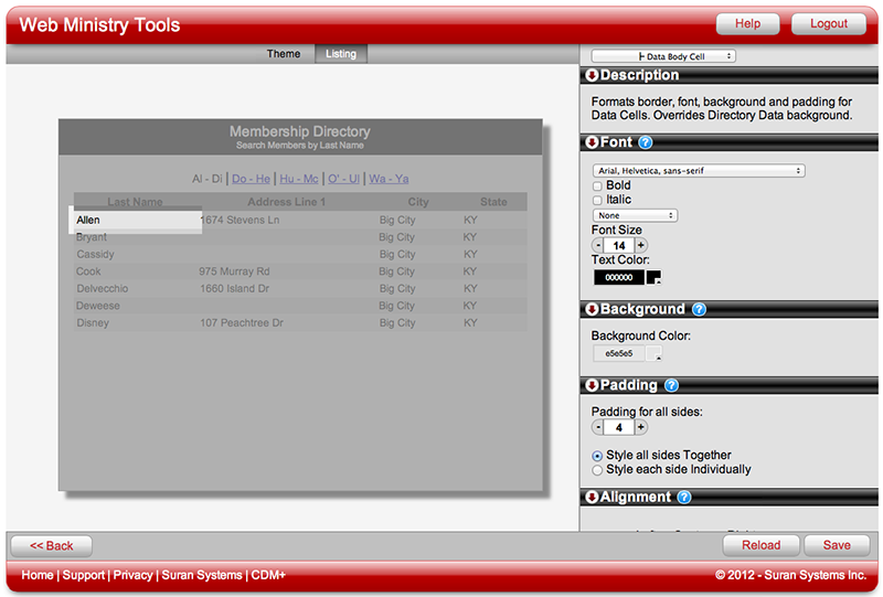 The Element Description will also indicate when common elements are grouped under one styling element. This is often seen with cells on a table, as shown in our example of the Designer for a Directory tool. When you select an element such as a Data Body Cell from the Element Dropdown List, only the first instance of Data Body Cell will be highlighted, but changes made to the styling properties will affect all instances of the Data Body Cell. Clicking to highlight any instance of Data Body Cell will allow you to style all of them, as well. Look for this feature on table cells and some groups of labels.