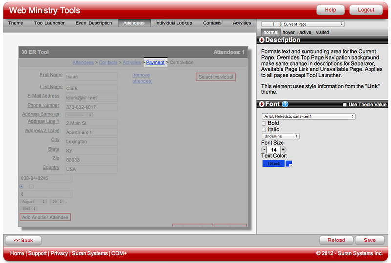 Our example is the multiple-page Single Event Registration Tool below, which has elements such as the Top Page Navigation links that appear on more than one page. Styling applies on all pages where they appear, and their properties can be accessed/changed on each page where they appear.