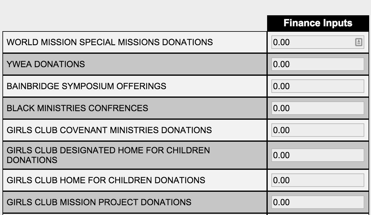 Follow the Service Commitments, you will see a list of available funds. Click in the field and enter the amount of this church's donation to each fund.