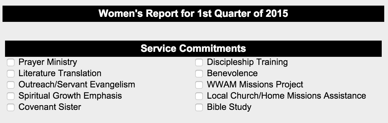 If there is only one church for which you can submit reports (or if you can submit reports for multiple churches, but there is only one church with outstanding reports), you will not see this page. Instead the Women's Report Tool will open to the following screen.