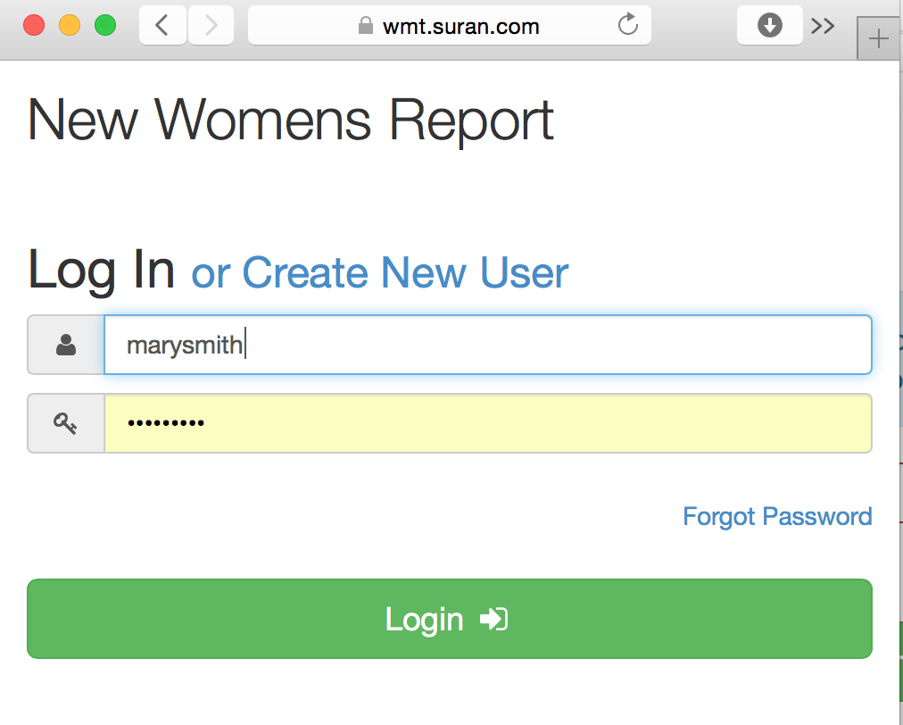 The Women's Report Tool requires a log in. The first time you use the tool, you will need to create a Username and Password.